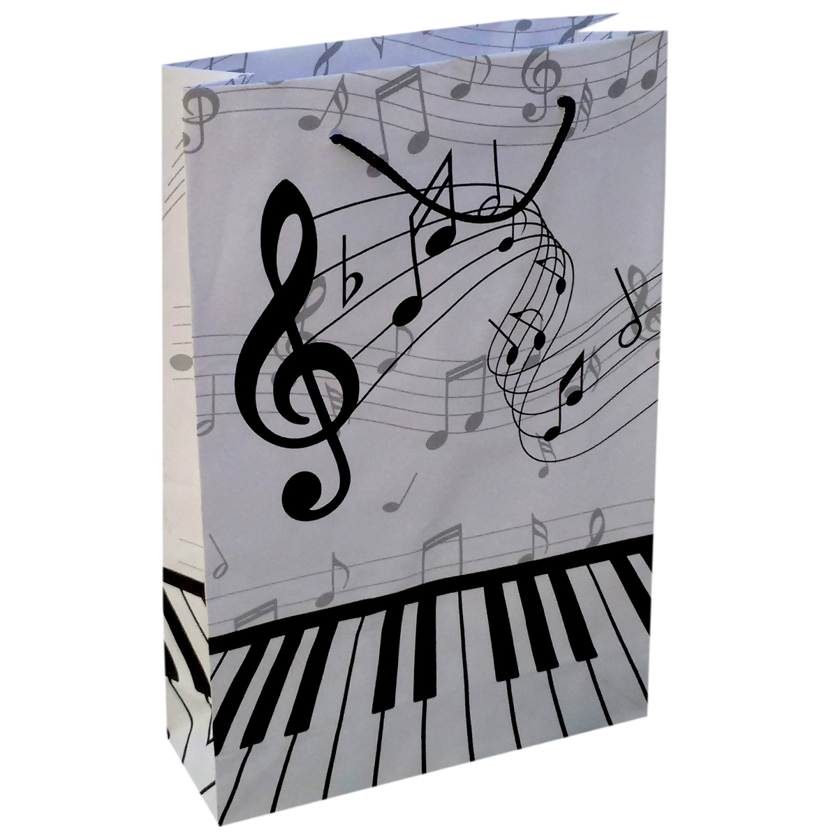 Dê o tom perfeito à sua embalagem com a Sacola de Papel Musical. O design preto-e-branco traz teclas de piano na base, notas flutuando em pauta e a clave de sol em destaque, criando um visual elegante que agrada desde festas infantis até eventos corporativos ligados à arte, música ou cultura.